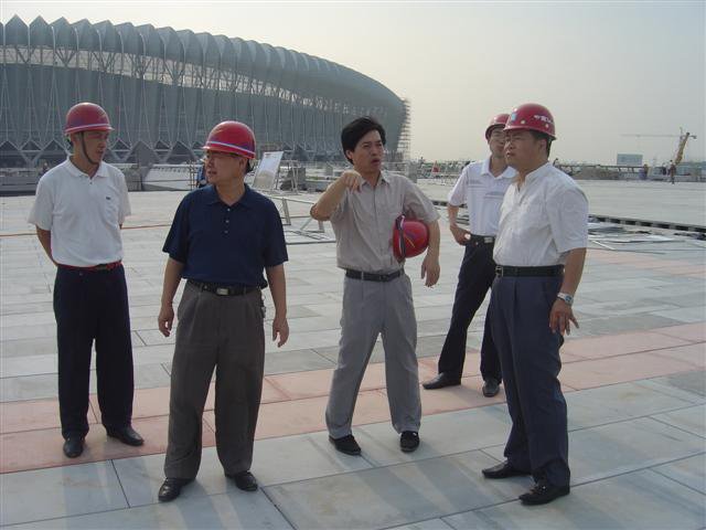 在山東省奧林匹克中心施工現(xiàn)場(chǎng)與項(xiàng)目管理負(fù)責(zé)人交流