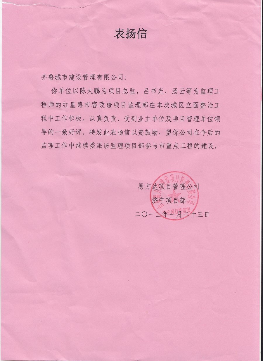 你單位以陳大鵬為項目總監(jiān)、呂書光、湯云等為監(jiān)理工程師的紅星路市容改造項目監(jiān)理部在本次城區(qū)立面整治工程中工作積極,認(rèn)真負(fù)責(zé),受到業(yè)主單位及項目管理單位領(lǐng)導(dǎo)的一致好評。特發(fā)此表揚信以資鼓勵,望你公司在今后的監(jiān)理工作中繼續(xù)委派該項目監(jiān)理部參與市重點工程的建設(shè)。
