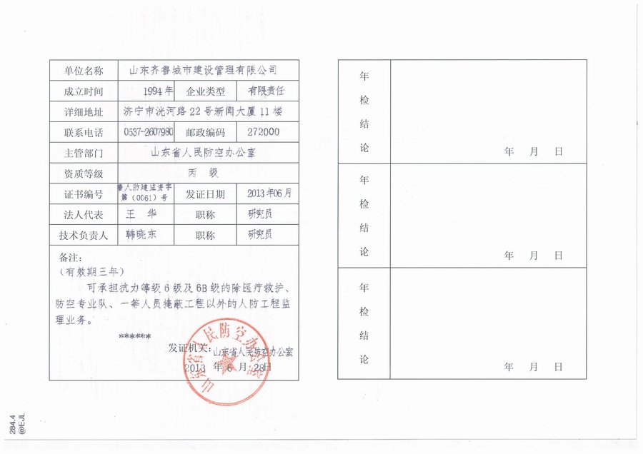 2013年6月28日,在建設系統五項資質的基礎上,我公司又取得了人防工程監理資質。這將為更好的服務于業主,拓展公司業務奠定了良好的基礎。