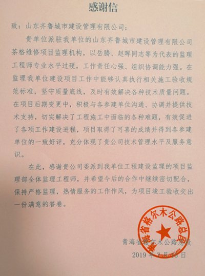 2019年7月20日,青海省格爾木公路總段領(lǐng)導(dǎo)到我公司青海監(jiān)理部送來一面印有“同心同德筑精品 盡職盡責(zé)抓管理”的錦旗及一封表揚(yáng)信。