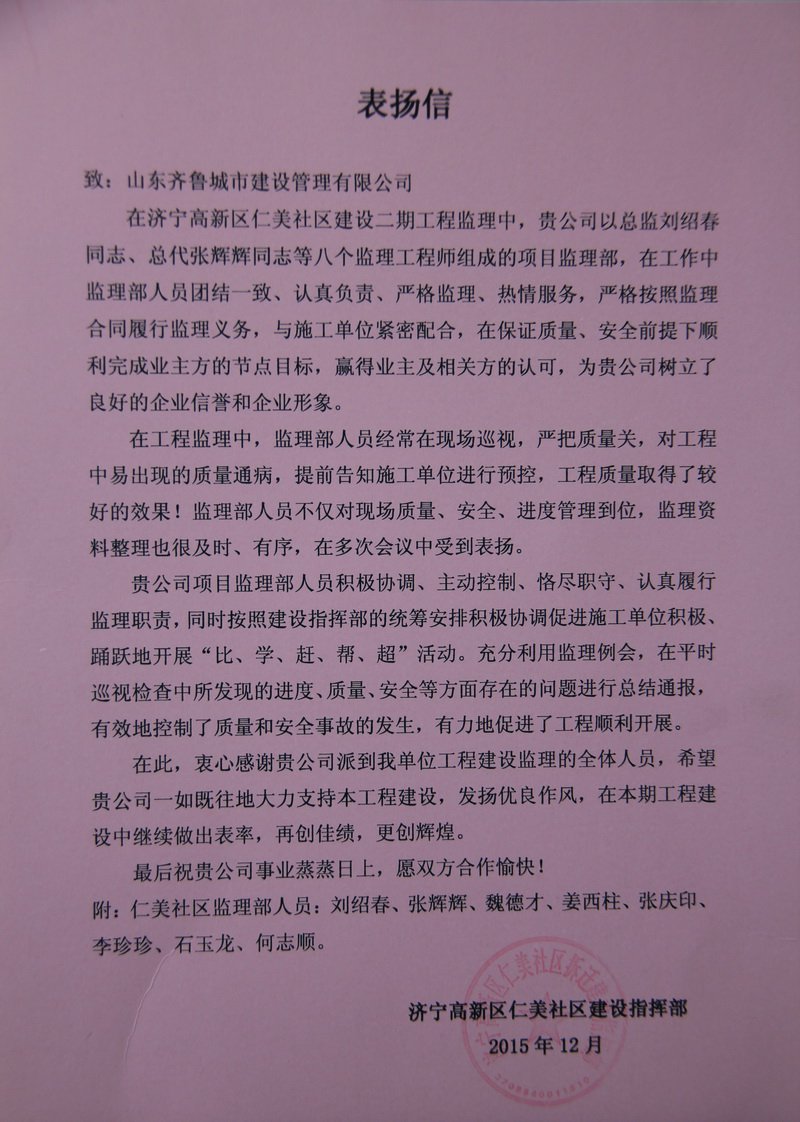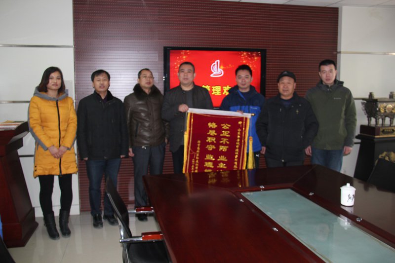 2016年1月20日濟寧高新區王因鎮人民政府仁美社區二期項目指揮部高主任、董主任及技術負責人趙工,一行三人來我公司,為我公司送來一面印有“公正不阿 業主滿意 恪盡職守 監理楷?!钡腻\旗,以表彰我公司駐濟寧高新區仁美社區二期劉紹春項目監理部對工程認真負責、嚴格監理的態度。杜紹坤副總、李樹玉總工、趙德沖主任親自接待了高主任一行,表示能夠得到指揮部領導的肯定,是對我們公司監理人員的高度評價,今后監理部的人員將以更加飽滿的熱情投入到工程后期的工作中去。