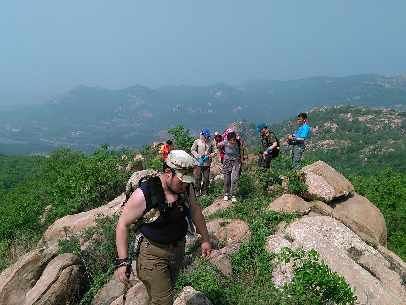 稍作休息,大家繼續(xù)前進(jìn)。由于穿越活動(dòng)不是走的景區(qū)路線,而是一些鮮為人知的非常規(guī)路線,大家還沒緩過勁來,便來到第二關(guān),巖石構(gòu)筑的小山尖。這里各種巨石林立,相互錯(cuò)亂的搭接,穿越隊(duì)要在狹小的巨石縫隙中尋找路徑,有時(shí)則需要爬上巨大光滑的石面小心行走,有些隊(duì)員不善于攀爬,有些則磨破了胳膊和衣服,隊(duì)員們互相幫助攜手前進(jìn),團(tuán)隊(duì)精神盡顯于此。在每位隊(duì)員來到巨石頂端時(shí),都禁不住松了一口氣,在山頂感受著被山風(fēng)吹在汗水浸濕的衣服上那酣暢的感覺。站在山頂,俯瞰山下一排排小房子錯(cuò)落在山間,在煙霧的籠罩下,構(gòu)成了一幅如詩如畫的美景,這樣的景象讓人豁然開朗、流連忘返。