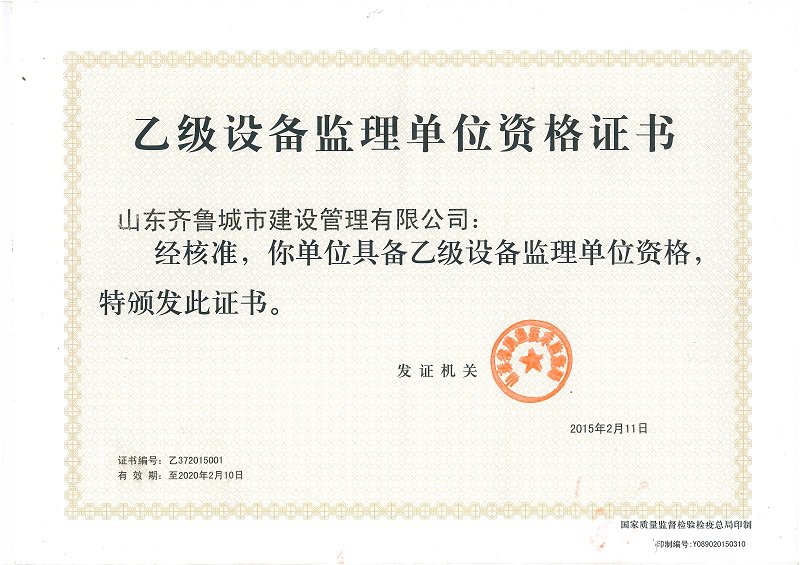 近日,山東齊魯城市建設管理有限公司又增加一項新的極有份量的業務監理資質:乙級設備監理資格。由國家質量監督檢驗檢疫總局統一印制證書,檢驗的設備監理專業范圍: