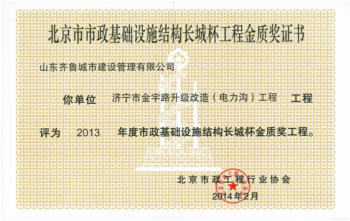 近日,我公司監理的濟寧市金宇路升級改造(電力溝)工程,被北京市政工程行業協會評選為2013年度北京市市政基礎設施結構長城杯金質獎工程!
