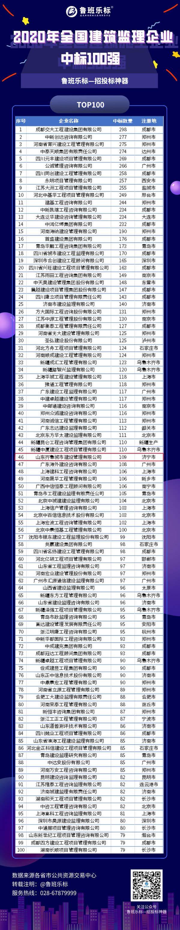 熱烈祝賀我公司名列2020年全國建筑監理企業中標100強第46位