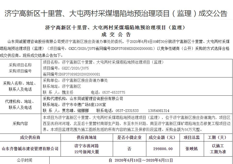 祝賀我公司濟寧高新區十里營、大屯兩村采煤塌陷地預治理項目(監理)中標