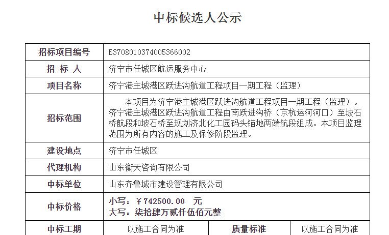 祝賀我公司濟寧港主城港區躍進溝航道工程項目一期工程(監理)中標